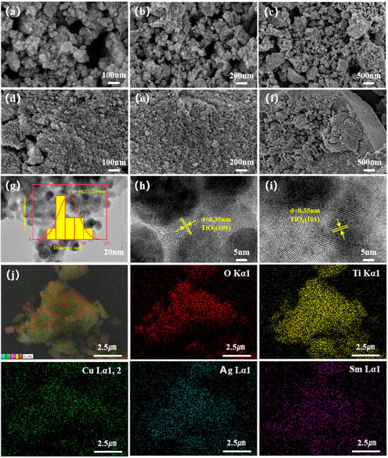 SEM (a–c) spectra of CuSmTi catalyst and SEM (d–f) and TEM (g–i) spectra and EDX mapping (j) of AgCuSmTi catalyst.
