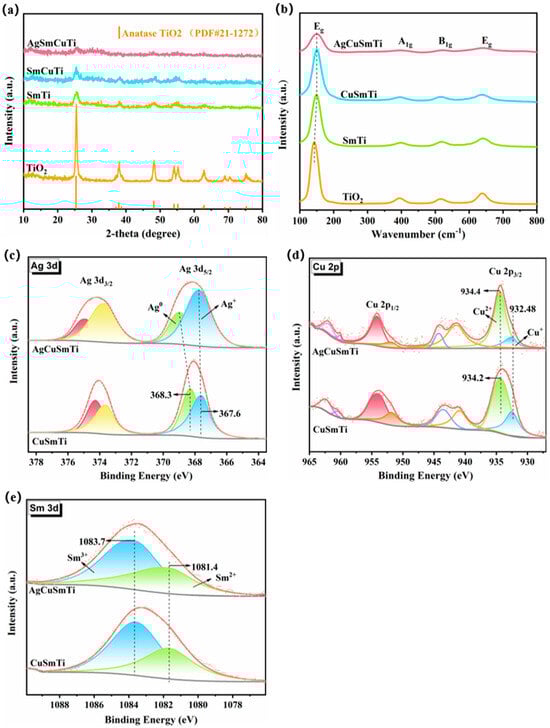 XRD (a), Raman (b), and XPS spectrum of (c) Ag 3d, (d) Cu2p, and (e) Sm 3d for catalysts.