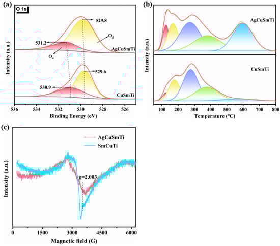 To further validate changes in oxygen vacancy concentration, EPR spectroscopy was employed for sample analysis. As illustrated in Figure 4c, all catalysts display a distinct EPR signal at g = 2.003, which is characteristic of oxygen vacancies []. Among them, the CuSmTi catalyst exhibits the strongest signal intensity, indicating a high concentration of oxygen vacancies on its surface. In contrast, the AgCuSmTi catalyst shows a significantly weakened EPR signal, suggesting a reduction in oxygen vacancy density. It can be inferred that the interaction between Ag and Cu contributes to the suppression of oxygen defects while simultaneously facilitating the mobilization and enrichment of lattice oxygen.