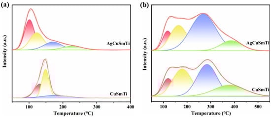 To further investigate the influence of active species on the catalyst surface and their reduction behavior in relation to catalytic performance, H2-TPR characterization was carried out on all catalysts, with the results presented in Figure 5a. The reduction profile of the CuSmTi catalyst can be divided into three distinct stages: the low-temperature peak (131 °C) corresponds to the reduction of Cu2+ to Cu+; the medium-temperature peak (149 °C) is attributed to the reduction of Cu+ to Cu0; and the high-temperature peak (178 °C) is associated with the reduction of CuO clusters []. These findings indicate that Cu species exist in multiple oxidation states and undergo progressive reduction to the metallic state through sequential electron transfer processes. Upon Ag doping, all three reduction peaks in the AgCuSmTi catalyst shift toward lower temperatures, suggesting a notable enhancement in the reducibility of Cu species. This improvement can be attributed to the synergistic interaction between Ag and Cu, which facilitates electron transfer and promotes the activation of oxygen species. Consequently, Cu2+ becomes more readily reduced to Cu+ and ultimately to Cu0. Additionally, a new reduction peak appears at approximately 228 °C for the AgCuSmTi catalyst, which is assigned to the reduction of Ag2O to metallic Ag0 []. The enhanced Ag–Cu interaction accelerates the redox reaction kinetics at lower temperatures, thereby improving the overall redox activity of the catalyst.