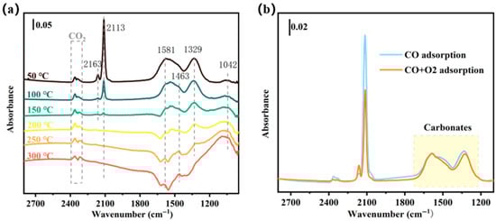 To elucidate the intermediate species and reaction mechanisms involved in CO oxidation over the AgCuSmTi composite metal oxide catalyst, in situ DRIFTS experiments were carried out under CO + O2 co-adsorption conditions at various temperatures. The results are presented in Figure 6a. Upon exposure to CO and O2, two main carbonate species formed via interactions between CO and surface oxygen species were observed: monodentate carbonate (1329 cm−1 and 1463 cm−1) [,] and bidentate carbonate (1042 cm−1 and 1581 cm−1) [,]. A distinct peak at 2113 cm−1 was assigned to Cu+-CO, whose intensity decreased with increasing temperature and vanished entirely above 150 °C. A peak at 2163 cm−1 was attributed to Cu2+-CO [,]. Additionally, broad bands in the range of 2285-2390 cm−1 corresponded to CO2 molecules, indicating the formation of gaseous CO2 as a result of CO oxidation []. As shown in the spectra, the band at 1581 cm−1, associated with bidentate carbonate, along with the peak at 1329 cm−1, representing monodentate carbonate, both diminished significantly with rising temperature. However, these features remained detectable even at 300 °C. In contrast, the peaks at 1463 cm−1 and 1042 cm−1 exhibited an opposite trend, showing increased intensity at higher temperatures. Considering the evolution of CO2 and Cu+-CO signals, it can be inferred that the thermal decomposition of carbonate species contributes significantly to the oxidation of CO at elevated temperatures.