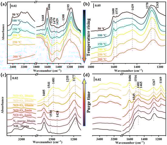 To further validate the above findings, a second set of experiments was conducted with a reversed reactant introduction order, where NH3 was introduced after NO + O2 had been pre-adsorbed on the catalyst. The results are shown in Figure 7d. Following 30 min of NO + O2 pre-adsorption, characteristic peaks corresponding to bidentate nitrate (1545 cm−1) and monodentate nitrate (1481 cm−1 and 1267 cm−1) were clearly observed. After introducing NH3 for 1 min, a new peak at 1169 cm−1 appeared, which is associated with L-acid centers. By 5 min, the intensities of the nitrate-related bands began to decrease, while signals corresponding to -NH2 species and Brønsted acid (B-acid) centers emerged. This evolution indicates that the adsorbed NO species interacted with the incoming NH3 via the L-H mechanism.