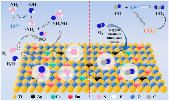 Figure 8 presents the proposed reaction pathway for the AgCuSmTi catalyst during the simultaneous removal of NO and CO. During the CO oxidation process, CO molecules adsorbed on the catalyst surface react with lattice oxygen to form either CO2 or carbonate species. Upon desorption of CO2, oxygen vacancies are generated, which are subsequently replenished by molecular oxygen, thereby facilitating continuous CO oxidation through lattice oxygen migration []. The detailed reaction mechanism is summarized as follows: