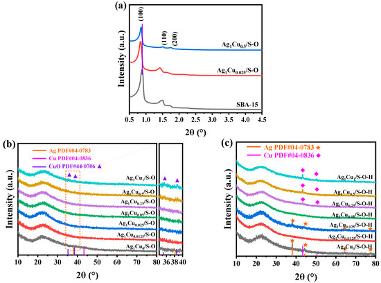 Narrow-angle XRD patterns (a) of SBA-15, Ag1Cu0.025/S-O and Ag1Cu0.5/S-O; wide-angle XRD patterns of the Ag1Cux/SBA-15 catalysts with different Ag/Cu molar ratios pretreated under different conditions: (b) 30.0 vol.% O2/Ar atmosphere at 500 °C for 2 h and (c) 30.0 vol.% O2/Ar atmosphere at 500 °C for 2 h followed by H2 atmosphere at 300 °C for 2 h.