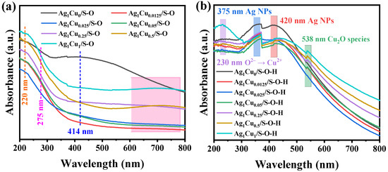 Due to the limitation of XRD for the detection of low-content species and the sensitivity of solid ultraviolet–visible diffuse reflectance (UV-vis DRS) spectra to Ag and Cu species, UV-vis DRS spectra were measured as a complementary method to recognize the Ag and Cu species in the Ag1Cux/S-O and Ag1Cux/S-O-H catalysts. Figure 2a presents the UV-vis DRS spectra of Ag1Cux/S-O. As depicted in Figure 2a, four adsorption peaks appeared at 220, 275, 414, and 600–800 nm. The ultraviolet adsorption peak at 220 nm was assigned to the 4d10–4d95s1 electron transfer of hydrated silver ions [41,42]. The peak at 275 nm was attributed to the Ag cluster characteristic absorbance bands [27]. The wide adsorption peak centered at ~414 nm was due to the plasma resonance in the surface of metallic Ag nanoparticles [43]. The absorbance band between 600 nm and 800 nm was assigned to the d-d orbital electron transition of the highly dispersed Cu2+ species [44]. All the Ag1Cux/S-O catalysts presented the adsorption peaks at 220 and 275 nm, indicating that the Ag species in Ag1Cux/S-O were hydrated silver ions and a small Ag cluster. With the increase in Cu molar ratio in Ag1Cux/S-O, the peak intensity of surface plasma resonance of metallic Ag nanoparticles decreased and disappeared. Meanwhile, the absorbance band between 600 nm and 800 nm was enhanced. This result suggested that Cu could affect the formation of Ag nanoparticles and improve their dispersion. As presented in Figure 2b, after the treatment of H2, the adsorption band between 600 and 800 nm, which is ascribed to the d-d orbital electron transition of Cu2+ species, disappeared in Ag1Cux/S-O-H. Meanwhile, the 4d10–4d95s1 electronic transition of Ag+ also vanished. The results suggested the successful reduction of high-valence-state Cu and Ag species to the metallic state, which was consistent with the XRD results (Figure 1). Additionally, two obvious adsorption bands appeared at ~375 and ~420 nm, which were assigned to the Ag nanoparticles found in all Ag1Cux/S-O-H catalysts. This further confirmed the successful reduction of Ag species. However, the absorbance band at ~230 nm, corresponding to the charge transfer between the ligand O2– and the Cu2+ in CuO, was only observed in Ag1Cu1/S-O-H, which might be attributed to its high Cu content. Meanwhile, the adsorption peak at ~538 nm was ascribed to the Cu2O species. Notably, with the increase in Cu molar ratio in Ag1Cux/S-O-H, the intensity of the adsorption peaks centered at ~375 and ~420 nm was gradually reduced, which also suggested the enhancement of Ag nanoparticle dispersion caused by the addition of Cu species. Furthermore, compared with Ag1Cu0/S-O-H, the addition of Cu in Ag1Cux/S-O-H catalysts induced the redshift; namely, the band shifted to a higher wavelength, to that of Ag nanoparticles (375 nm and 420 nm), which was ascribed to the interaction between Ag and Cu [45]. Therefore, it could be deduced that the O2 treatment followed by H2 treatment induced the formation of Ag-Cu interactions.
