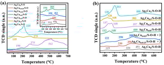 The redox properties of the as-prepared Ag1Cux/SBA-15 catalysts pretreated under different conditions were studied by temperature-programmed H2 reduction (H2-TPR). For the Ag1Cu0/S-O catalyst (Figure 3a), three reduction peaks were found at 115, 333, and 456 °C, which were assigned to the reduction in surface adsorption oxygen species, Ag2O clusters presented in the outside SBA-15 pores, and small-sized Ag2O clusters in the SBA-15 channels, respectively [46,47]. However, after the introduction of Cu in the catalysts, the reduction peak of surface adsorption oxygen disappeared. Meanwhile, with the improvement in the Cu molar ratio, reduction peaks for CuO species appeared. The reduction peak centered below 200 °C was attributed to the reduction of Cu2+ to Cu+ [45]. The reduction of Cu+ to Cu0 was observed at a higher temperature, at 200–300 °C [48,49]. Notably, as the Cu content increased, some of the Ag2O species reduction peaks shifted to a higher temperature, which indicated that the recommendation of Cu species might weaken the reduction of Ag2O species. Figure 3b depicts the H2-TPR profiles of Ag1Cux/S-O-H catalysts. As shown in Figure 3b, similar to the Ag1Cu0/S-O catalyst, there were also three reduction peaks centered at 119, 334, and 451 °C, corresponding to surface adsorption oxygen species reduction. The Ag2O in the surface of the SBA-15 support and the small Ag2O cluster in the pore channel of SBA-15, respectively, were found in Ag1Cu0/S-O. After Cu species introduction, new peaks located below 200 °C were observed, which were ascribed to the reduction of Cu2O or CuO species in the catalysts. Furthermore, as the Cu molar ratio improved, the reduction peaks below 200 °C were enhanced gradually. However, the reduction peaks of Ag+ species were shifted to higher temperatures. Notably, new weak reduction peaks at 230 and 258 °C, which were assigned to the Ag-Cu interaction, could be found in Ag1Cu0.0125/S-O-H and Ag1Cu0.025/S-O-H, respectively, which suggested the presence of strong Ag-Cu interaction in and Ag1Cu0.025/S-O-H. This was in accord with the result of UV-vis DRS spectra. Additionally, the weakness of these Ag-Cu interaction reduction peaks was ascribed to the ultra-low Cu in Ag1Cu0.0125/S-O-H (0.026 wt%) and Ag1Cu0.025/S-O-H (0.054 wt%). Meanwhile, the low-temperature reducibility could also be found in Ag1Cu0.025/S-O-H. Therefore, the Ag1Cu0.025/S-O-H catalyst with the strong Ag-Cu interaction presented better low-temperature reducibility.