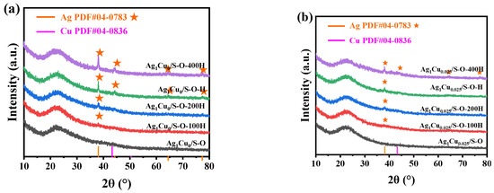 The crystal structure of Ag1Cu0/S-O-yH and Ag1Cu0.025/S-O-yH catalysts was studied via XRD. Figure 5a displays the XRD patterns of Ag1Cu0/S-O pretreated under an H2 atmosphere at different temperatures. Compared with Ag1Cu0/S-O, as the reduction temperature increased, and the new diffraction peaks, corresponding to Ag species, appeared and were enhanced, which suggested that the H2 treatment induced the reduction of Ag+ species to Ag0 species. Meanwhile, the enhanced diffraction peaks indicated the formation of big Ag nanoparticles, which might be ascribed to the aggregation of Ag species during the high-temperature reduction. Figure 5b presents the XRD patterns of the as-prepared Ag1Cu0.025/S-O-yH catalysts. As illustrated in Figure 5b, compared with Ag1Cu0.25/S-O, H2 reduction treatment induced the generation of Ag species. Meanwhile, with the reduction temperature improved, the diffraction peak intensity of Ag species gradually increased. However, the diffraction peaks corresponding to Cu or CuO species were not observed in Ag1Cu0.025/S-O-yH, which might be attributed to the lower Cu addition of the high interspersion of Cu or CuO species.