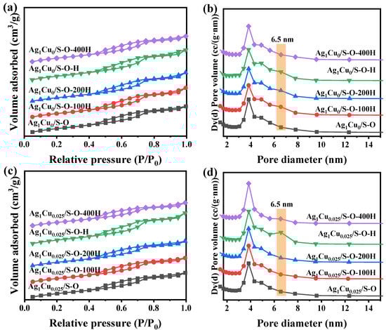 Specific surface area, pore size distribution, and the pore volume of Ag1Cu0/S-O-yH and Ag1Cu0.025/S-O-yH were determined via N2 adsorption–desorption curves. Brunauer–Emmett–Teller (BET) and Barrett–Joyner–Halenda (BJH) methods were applied to evaluate the surface area and pore size distribution of the samples, respectively. Figure 7 shows the N2 adsorption–desorption curves and pore size distribution of Ag1Cu0/S-O-yH and Ag1Cu0.025/S-O-yH, and the corresponding physical parameters were summarized in Table 3. As presented in Figure 7a, all the N2 adsorption–desorption curves of Ag1Cu0/S-O-yH presented a typical IV-typed isotherm attendant by an H1-type hysteresis loop, indicating the existence of the mesopore structure in Ag1Cu0/S-O-yH [52,53]. Meanwhile, the pore size distribution in Figure 7b illustrates a pore size of 3.0–7.7 nm, which also demonstrates the existence of a mesopore structure in the samples. The result suggested the reduction treatment would not influence the pore size of Ag1Cu0/S-O-yH. Notably, the sample treated under an H2 atmosphere at 300 °C, Ag1Cu0/S-O-H, displayed an enhanced peak at 6.5 nm in pore size distribution (Figure 7b), indicating the formation of new pores with a pore size of ~6.5 nm in Ag1Cu0/S-O-H after 300 °C H2 treatment. Meanwhile, the BET surface area and pore volume of Ag1Cu0/S-O-H (503 m2/g and 0.663 cm3/g) were increased in comparison to Ag1Cu0/S-O. Figure 7c,d depict the N2 adsorption–desorption curves of Ag1Cu0.025/S-O-yH catalysts. As displayed in Figure 7c, similar to Ag1Cu0/S-O-yH, all the N2 adsorption–desorption curves of Ag1Cu0.025/S-O-yH catalysts also presented the typical IV-typed isotherm accompanied by an H1-type hysteresis loop. Meanwhile, similar pore size distributions were also observed in Ag1Cu0.025/S-O-yH. Notably, the introduction of Cu could cause the formation of new pores at a pore diameter of ~6.5 nm (Figure 7d). Additionally, compared with Ag1Cu0/S-O-yH, the surface area of Ag1Cu0.025/S-O-yH was decreased, which might be ascribed to the occupation of Cu species in the pore channel, indicating the successful introduction of Cu in Ag1Cu0.025/S-O-yH [54,55]. Furthermore, compared with Ag1Cu0.025/S-O, the BET surface area of Ag1Cu0.025/S-O-yH increased first and then decreased as the reduction temperature increased. Among these, Ag1Cu0.025/S-O-yH presented the largest BET surface area (492 m2/g), pore volume (0.68 cm3/g), and pore size, with a higher pore volume. It had been reported that the large surface area and pore volume would be beneficial for the adsorption and diffusion of substrate molecules, which could improve catalytic performance [56,57].