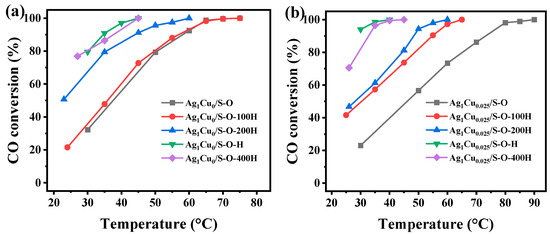 As mentioned above, the H2 reduction treatment greatly enhanced the catalytic activity of Ag1Cux/S-O for CO degradation. Meanwhile, Ag1Cu0/S-O-H (T98 = 41 °C) and Ag1Cu0.025/S-O-H (T98 = 34 °C) presented better CO degradation activity. Thus, Ag1Cu0/S-O and Ag1Cu0.025/S-O were selected to further investigate the influence of H2 reduction temperatures on CO degradation performance. Ag1Cu0/S-O and Ag1Cu0.025/S-O were treated under 100, 200, 300, and 400 °C to obtain Ag1Cu0/S-O-yH (y = 100, 200, 300 and 400 °C, represented H2 reduction temperature) and Ag1Cu0.025/S-O-yH. Among these reduced catalysts, Ag1Cu0/S-O-300H and Ag1Cu0.025/S-O-300H were further abbreviated as Ag1Cu0/S-O-H and Ag1Cu0.025/S-O-H, respectively.