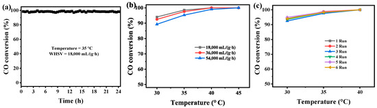 Stability (a), the effect of WHSV (b), and reusability (c) of Ag1Cu0.025/S-O-H for CO oxidation.
