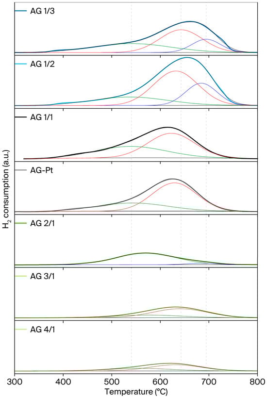 The H2-TPR profiles of the calcined AGs are shown in Figure 2. In every catalyst, similar behavior was observed—one peak with three different observable regions. The first section, up to 530 °C, was attributed to the interaction between the NiO and the alumina [43,44]. The intermediate peak (from 530 to approximately 640 °C) corresponded to the same species with stronger interactions. Finally, the H2 consumption from 640 to 680 °C was ascribed to the reduction in the NiAl2O4 spinel [45,46], which became apparent in the calcination step of the synthesis. The presence of these species was confirmed by the XRD results. Figure 2 shows how AG 2/1, AG 3/1, and AG 4/1 presented a lower amount of NiO than the rest of the catalysts. In the case of AG 1/2 and AG1/3 with higher nickel contents, Ni was more extensively reduced, and the formation of aluminates was observed.