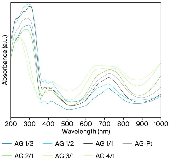 The bands displayed in the UV-visible diffuse reflectance spectroscopy (UV-vis DRS) spectra (Figure 4) correspond to the different Ni-containing species present in the catalytic samples. The absorption bands in the 250–300 nm region are attributed to NiO species. These bands increase in intensity with metal loading and shift to longer wavelengths (red shift) based on the strong interaction between the Ni2+ and the metal support. The bands appearing at these wavelengths have been previously related to the transition of the O2− (2p)→Ni2+ (3d) charge transfer, which is characteristic of NiO species [47]. The second band, located at the 600–800 nm region, can be attributed to the contributions of the NiAl2O4 spinel and NiO species. Catalysts with lower Ni contents (AG 3/1 and AG 4/1) showed a higher absorbance and a flatter shape, which explains the small contribution of the d→d transitions from the tetrahedral Ni2+ of the spinel species [48] (as seen in the XRD results). On the other hand, catalysts with higher metal contents (such as AG 1/3 or AG 1/2) showed a profile similar in shape to the typical d→d transitions of Ni2+ in the NiO [49].