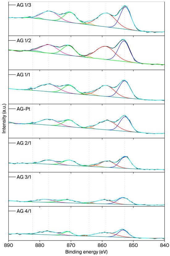The elemental composition of the surface and oxidation state of the metals were studied via X-ray photoelectron spectroscopy (XPS) and are shown in Table 3. In all cases, the Al/Ni atomic ratios obtained using XPS were higher than the ratios obtained using ICP-OES, indicating lower nickel loading on the surface than expected, probably due to the defective distribution of the metals during the synthesis or the difference in the general content of each metal, as shown by ICP-OES. In the case of AG-Pt, 0.01% of Pt was detected with the Pt 4d5 signal, which translates into an Al/Pt atomic ratio of 2068.