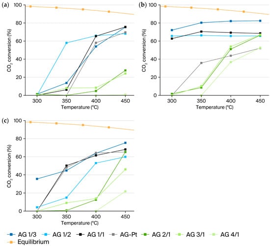 When visible light was used as an activity enhancer, CO2 conversions were generally higher in comparison to those achieved under dark conditions. Additionally, almost all the catalysts presented activity starting at around 400 °C, in contrast to the results achieved under dark conditions. In particular, AG 1/1 and AG-Pt showed catalytic activity starting at 300 and 350 °C, respectively, highlighting their potential to reduce the energy demand of methanation, despite AG-Pt displaying slightly lower overall conversion levels (besides AG 1/3, which showed catalytic activity as low as 250 °C). Furthermore, under visible light conditions, the selectivity towards CH4 improved with respect to dark conditions, reaching values close to 100% at the highest temperatures in all cases.