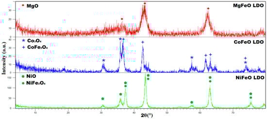 On the other hand, transition metal-based materials Co and Ni exhibited a larger number of diffraction signals than Mg/Fe, and their patterns differed from each other. The Co/Fe material showed ten diffraction peaks, which were assigned to the presence of two crystalline-phase spinels—Co3O4 (37%) [] and the compound CoFe2O4 (63%) []. In the case of the Ni/Fe material, nine diffraction peaks were identified, which were associated with the formation of a mixture of oxides similar to that of the Co/Fe system, specifically NiO (76.4%) and NiFe2O4 (23.6%) [].