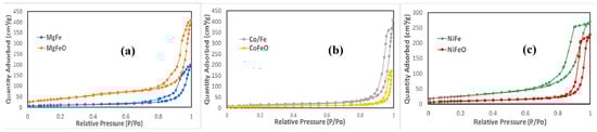 Figure 8 shows the adsorption–desorption isotherms of N2, in which the type III isotherm shape was identified according to the IUPAC classification []. All materials show an H3-type hysteresis loop, indicating capillary condensation during the process. Table 6 summarizes the BET area and pore volume values obtained. In this study, materials in oxide form containing two different types of oxides, such as the spinel phase (CoFe2O4 and NiFe2O4) and the respective oxides of divalent metal (Co3O4 and NiO), presented a decrease in surface area and pore volume. This behavior supports what has been reported in the literature, which suggests that the sintering of the oxides to form the spinel phase causes such a reduction []. However, the Mg-based material exhibited different behaviors. The heated derivative increased both the pore area and pore volume. This material did not present the spinel phase (MgFe2O4), which influences the surface area of the obtained material, a phenomenon that has also been reported in previous studies.
