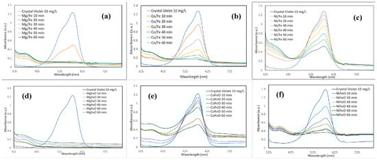 Violet crystal decoloration with stirring using (a) MgFe, (b) MgFeO, (c) CoFe, (d) CoFeO, (e) NiFe, and (f) NiFeO.