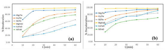 The decoloration percentage achieved after 60 min is summarized in Figure 10. The Mg/Fe oxide catalyst reached up to 98% CV removal, while the hydroxide form achieved 93% (Table 6). Agitation enhanced decoloration efficiency, particularly during the first 30 min of the reaction. For MB, similar trends were observed (Figure 11 and Table 7): Mg/Fe and Co/Fe catalysts were more effective than Ni/Fe, with the oxide forms again showing slightly higher performance. In the case of Ni/Fe, heating treatment and agitation produced a more noticeable improvement, increasing decoloration by approximately 10%. All catalysts were evaluated both with and without stirring, as shown in Table 7 and Table 8.