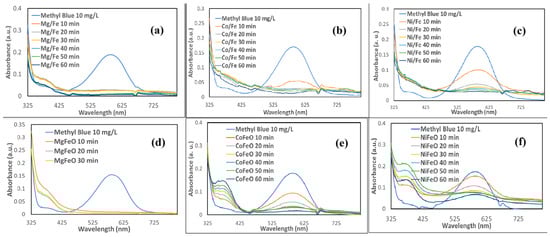 Methyl blue decoloration with stirring using (a) MgFe, (b) MgFeO, (c) CoFe, (d) CoFeO, (e) NiFe, and (f) NiFeO.
