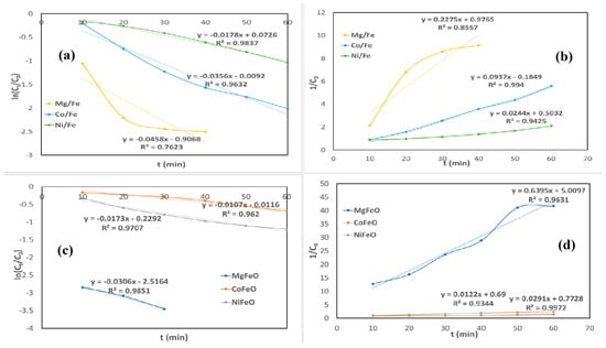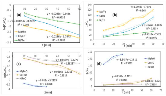 Regarding kinetic model fitting, the pseudo-second-order model provided the best correlation (R2) for Mg- and Co-based catalysts, while the Ni-based material was better described by the pseudo-first-order model (Figure 12). This suggests that chemical adsorption or surface interaction might dominate in the former, whereas diffusion or physisorption may play a more significant role in the latter.