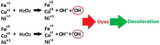 Advanced oxidation processes (AOPs) have shown promising results for dye decoloration without the need to employ specific radiation or specialized reactors, as is the case in photocatalysis []. Therefore, optimizing an advanced oxidation process, such as the Fenton reaction, is of particular interest. This reaction is usually catalyzed by Fe2+ and Fe3+ species, which participate in a cycle of valence state changes by reacting with hydrogen peroxide, generating the hydroxyl radical (●OH) or hydroxyl ion (-OH) (Equation (1)). The activated ●OH species is highly oxidizing (2.8 eV) and favors the decoloration of organic compounds []. This radical reacts with pollutants by interacting with the hydrogen atoms present in their molecules, thus initiating their decoloration (Equation (2)). In addition, the hydroxyl group can react and incorporate into the contaminant molecule, degrading it to a less harmful species or to simple products such as CO2 and H2O [] (Equation (3)).