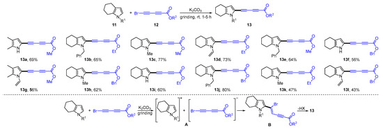 Mechanochemically induced C–H alkylation [80], showing the following advantages like environmental protection, high atom economy, wide substance scope, avoiding harmful solvents, reducing energy consumption and cost [81], is in line with the requirements of green synthesis. The C–H butadiynylation of pyrrole was disclosed by Szafert in 2015 [82] (Scheme 4). In the presence of K2CO3, the cross-coupling of pyrrole (11) and 1-halobutadiyne (12) proceeded smoothly under milling condition to give the corresponding butadiynyl-substituted pyrrole (13) in moderate to good yields. The unsubstituted and benzyl-, methyl-, vinyl-functionalized 4,5,6,7-tetrahydroindoles were suitable for this coupling reaction, forming the target 13a–13d in reasonable yields. Methyl-, benzyl- and ethyl-substituted butadiynoates were also tolerated well under this reaction conditions, producing the corresponding 13e–13l in 43–80% yields. Based on the reported work [83], the reaction mechanism was proposed. Firstly, treatment of 11 and 12 with K2CO3 under grinding formed the ion-radicals pair A via single electron transfer. Addition of the C≡C bond generated the intermediate B. Elimination of hydrogen halide from B gave the desired product (13). The procedure, yielding butadiynyl-substituted pyrroles through a convenient grinding of reactants in a mortar under solvent-free conditions, would be recognized as the first example of mechanochemical pyrrole butadiynylation and could be useful in the field of organic synthesis especially in drug synthesis.