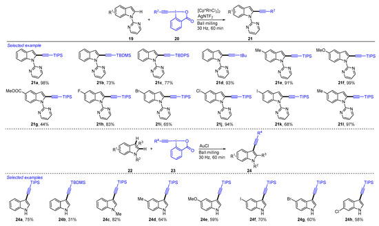 In 2018, Bolm [85] described mechanochemical Rh(III)– and Au(I)–accelerated C–H alkynylations of indoles (Scheme 6). After probing the reaction in detail, the best conditions were presented as follows: a mixture of indole (19, 0.6 mmol), ethynyl-substituted 1,2–benziodoxol–3–(1H)–one (20, 0.66 mmol), [Cp*RhCl2]2 (0.03 mmol) and AgNTf2 (0.012 mmol), ball-milling in a stainless-steel vessel (10 mL) with a ball (1 cm). The reaction was compatible with several substituents such as triisopropylsilyl (TIPS), tert-butyldimethylsilyl (TBDMS), tert-butyldiphenylsilyl (TBDPS) and tBu, forming the 2-alkynylated indoles (21a–21d) in 73–98% yields. Whether incorporated with electron-rich (Me, OMe) or electron-poor (MeOC(O), F, Br, Cl, I) groups, indoles reacted with 20 smoothly to generate the target alkynylated indoles (21e–21k) in moderate to excellent yields. Instead of [Cp*RhCl2]2/AgNTf2 catalytic system, AuCl catalyzed alkynylations of indoles formed the 3-alkynylated indoles. Ball-milling the mixture of 19, 20 and AuCl at 30 Hz for 60 min produced the corresponding 3-alkynylated indoles (24). Both of the TIPS- and TBDMS-functionalized 1,2–benziodoxol–3–(1H)–ones survived well under this reaction conditions, resulting in the generation of 24a–24c in 31–82% yields. Indoles bearing electron-donating (Me, OMe) or electron-withdrawing (I, Br, Cl) groups were also suitable for this reaction, leading to the formation of target 24d–24h in moderate yields. Compared to conventional reactions [86,87,88,89,90,91,92,93,94], this method displayed diverse advantages like short reaction time, small catalyst loading, good selectivity and high yields. Additionally, the reaction showed good scalability, affording 21a in 98% yield (730 mg) in a 2.0 mmol scale reaction.