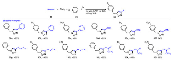 1,2,3–Triazoles not only are important moieties in pharmaceuticals but also could be applied as directing-groups in C–H activation transformations [99,100,101]. Copper–catalyzed azide-alkyne cycloaddition (CuAAC) reactions, displaying some advantages like high yields, mild reaction conditions, wide substance scope and good orthogonality [102], was an efficient protocol towards 1,4-substituted-1,2,3-triazoles and could be extensively applied in organic synthesis [103], medicinal chemistry [104], surface and polymer chemistry [105]. A mechanochemical CuAAC reaction between alkynes and azides was developed by Mack in 2013 [106]. Under solvent-free conditions, phenylacetylene (28), benzylbromide (29), sodium azide and a copper mill ball, milling in a copper reaction vessel for 15 min, and the only product 1–benzyl–4–phenyltriazole (30) could be isolated directly from the reaction flask without further purification (Scheme 8). This CuAAC reaction was compatible with phenyl-substituted alkynes bearing electron-withdrawing (Br, NO2) groups on the phenyl ring to give the corresponding products (30b, 30c) in >95% and 33% yields, respectively. Trimethyl silyl acetylene, 1-hexyne and ethyl but-3-ynoate also worked well, generating 30d–30l in good to excellent yields. Compared to the traditional CuAAC reaction which usually proceeded in organic solvents with long reaction time using copper catalyst [107], this method produced 1,2,3-triazoles in high yields under solvent-free condition without any common copper catalysts.
