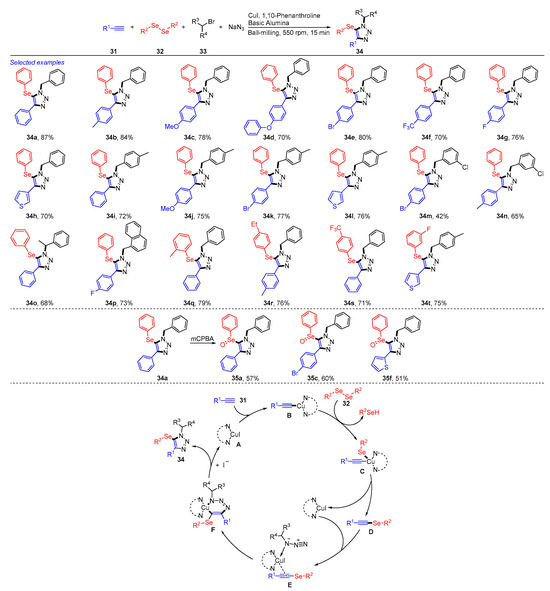 In 2023, Brahmachari [108] displayed a multi-component reaction of aryl/heteroaryl acetylene (31), diaryl diselenide (32), benzyl bromide (33) and sodium azide under high-speed ball milling conditions to synthesize selenotriazole (Scheme 9). After screening the reaction conditions in detail, the best reaction conditions were established as following: A mixture of phenylacetylene (31, 0.2 mmol), diselenide (32, 0.2 mmol), bromide (33, 0.2 mmol), CuI (0.02 mmol), 1,10-phenanthroline (0.02 mmol) and sodium azide (0.2 mmol), ball-milling in a stainless-steel jar (25 mL) with 7 basic alumina surface balls (pH = 8.01, 1.5 g, 10 mm) at 550 rpm for 15 min. While the neutral and acidic surface ball milling gave the target product in lower yields and stirring the reaction mixture without ball milling did not form the product at all. When the above optimal reaction conditions were employed to explore the scope of substances, different phenylacetylenes incorporating with electron-rich (Me, OMe, OPh) and electron-poor (Br, CF3, F) groups showed pleasure tolerance, leading to 34b–34g in high yields. 3-Ethynylthiophene was also applicable to afford the expect 34h in 76% yield. Benzyl bromide with methyl or chloro group at the phenyl moiety survived well, forming the desired 34i–34n in 42–77% yields. (1-Bromoethyl)benzene and 1-(bromomethyl)naphthalene were tolerated as well, resulting in the generation of 34o and 34p in 68% and 73% yield, respectively. Both of the electron-donating (Me, Et) or electron-withdrawing (CF3, F) groups incorporated diphenyl diselenides were applicable in this multicomponent reaction, furnishing the expected 34q–34t in high yields. Since selenones are interesting moieties in bioactive molecules and natural products [109], the authors carried out the oxidation of the above selenotriazoles. Treatment of selenotriazoles (34) with m-chloroperbenzoic acid (mCPBA) formed the expected selenones (35a–35c) in moderate yields. According to the previous work [110,111,112,113,114] and the control experiments, a plausible mechanism was outlined. Initially, coordination of CuI with 1,10-phenanthroline gave the active Cu(I)-coordination complex A, which was then transformed to the intermediate B by reacting with acetylene (31). The ethynyl selane D was then generated by reductive elimination of copper(II)-complex C which was generated by the reaction of B with diselenide. Then, the intermediate E was obtained through the reaction of A, D and benzyl azide which was in-situ generated via the reaction of benzyl bromide (33) and sodium azide. The oxidative cyclization of E then occurred to produce the six-membered Cu(II)-coordinating complex F, which was then converted into the final products (34) with the regeneration of active complex A to complete the catalytic cycle. This procedure, displaying some notable advantages such as one-pot manner, avoiding the use of solvent and heating, short reaction time, pleasure yields and wide substance scope, was an efficient, green and practical protocol towards selenotriazoles as well as bioactive selenones.