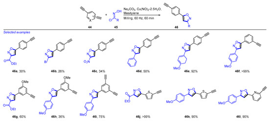 In 2023, Forgione [118] realized the mechanochemical desymmetrization of bisalkynes (44) with hydroxyimidoyl chlorides (45) to obtain 3,5–isoxazole-alkyne adducts (46). After screening the reaction conditions carefully, the optimized reaction conditions were attained as following: a mixture of 44 (0.396 mmol), 45 (0.396 mmol), Cu(NO3)2–2.5 H2O (0.396 mmol), Na2CO3 (0.796 mmol) and mesitylene (η = 0.25 μL/mg), milling with 8 balls at 60 Hz for 60 min. This reaction was compatible with various hydroxyimidoyl chlorides involving ester, bromo, nitro and phenyl groups (46a–46d). 1,4–Diethynylbenzene, 1,3–diethynylbenzene, 1,3–diethynyl–5–methoxybenzene, 1,3,5-–riethynylbenzene, 2,5–diethynylthiophene and 2,6–diethynylpyridine worked well under this reaction conditions, leading to the generation of 46e–46l in 36%–>99% yields (Scheme 12). Compared with the usual synthetic methodologies using excess amount of one of the substrates or protecting groups to achieve reasonable selectivity [119,120,121,122,123,124], this work was the first example of preparing 3,5–isoxazole–alkyne adducts with excellent selectivity from equimolar quantity of bis-alkynes and hydroxyimidoyl chlorides and showed potential applications in the synthesis of drugs or natural products with 3,5–isoxazole skeleton.