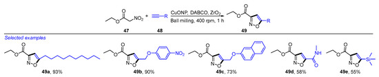 A mechanochemical CuO nanoparticles accelerated cyclocondensation was established to construct isoxazole framework by Karthikeyan in 2021 [125]. In the presence of 1,4–diazabicyclo[2.2.2]octane (DABCO), CuO nanoparticles (CuONP) and ZrO, α–nitroethylacetates (47) reacted with terminal alkynes (48) efficiently to generate the target isoxazoles (49a–49e) in 55–93% yields (Scheme 13). This procedure, undergoing under mild reaction conditions, was a valuable and efficient approach towards functionalized isoxazoles. But the substance scope was required to extend.