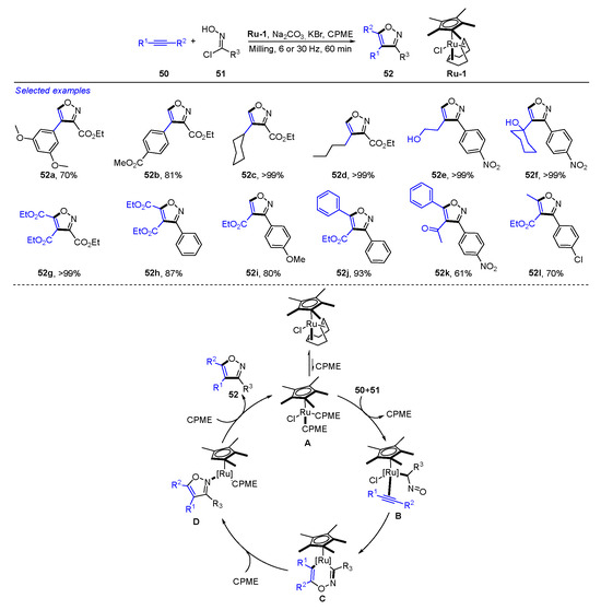 The isoxazole moiety could be also built through ball-milling-enabled Ru-promoted regiodivergent cycloaddition of alkyne and hydroxyimidel chloride [126]. After investigating the reaction in detail, the optimal reaction conditions were acquired as follows: a mixture of alkyne (50, 0.586 mmol), hydroxyimidel chloride (51, 0.924 mmol), Ru–1 catalyst (0.0467 mmol), Na2CO3 (0.612 mmol), KBr (150 wt%, 409 mg) and cyclopentyl methyl ether (CPME, η = 0.9 µL/mg, 612 µL), ball-milling in a Teflon Jar (25 mL) with one SS ball at 6 or 30 Hz for 60 min. Both of the phenyl and alkyl involved alkynes were tolerated well under these conditions, forming the desired isoxazoles (52a–52f) in 70%–>99% yields. Hydroxyimidel chlorides containing ethoxycarbonyl, phenyl, 4-methoxyphenyl, 4-nitrophenyl or 4-chlorophenyl group were also applicable in the manufacture of 52g–52l as well. The authors also revealed the proposed mechanism. The addition of CPME to Ru–1 catalyst formed the catalytically active Ru species A. Treatment of A with 50 and 51 generated the intermediate B with the elimination of CPME. Oxidative coupling of B afforded the six-membered ruthenacycle C, which was then transformed into the five-membered intermediate D with the action of CPME. The reductive elimination of D was then occurred to give the desired isoxazole and regenerate the active Ru species A to finish the catalytic cycle (Scheme 14). It was worth mentioning that this protocol produced isoxazoles in high yields with wide substance scope under solvent-free, short reaction time and solid-state conditions. However, the common protocols displayed some limitations like big dilution factors, long reaction time and limited substance scope [127,128].