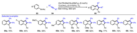 Ball-milling-induced and Rh–catalyzed cycloaddition of acetanilide with alkyne to access indole was achieved by Bolm in 2023 [50]. Acetanilides with either electron-withdrawing (F) or electron-donating (OMe, Me) groups demonstrated high tolerance, leading to 55a–55f in 45–70% yields. Various phenyl/alkyl-disubstituted alkynes applied well in this reaction, resulting in the corresponding products (55g–55i) in good yields (Scheme 15). Although the yields and substance scope remained to improve, this reaction proceeded smoothly under mild conditions such as solvent-free, low temperature and catalytic amounts of Cu(OAc)2. However, using over-stoichiometric amount of Cu(OAc)2 at 100 °C was required to realize high yield in common reaction [129,130].