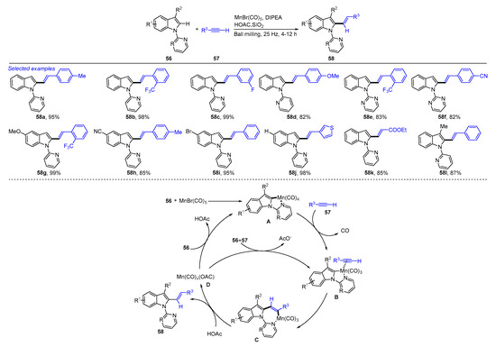 A mechanochemical Mn(I)-promoted selective alkenylation of indoles to access 2–alkenyl indoles was presented by Chatterjee in 2020 (Scheme 16) [51]. After examining the reaction carefully, the best conditions were presented as following: a mixture of indole (56, 1 mmol), alkyne (57, 1.3 mmol), MnBr(CO)5 (0.1 mmol), N,N–diisopropylethylamine (DI–EA, 0.2 mmol), acetic acid (0.2 mmol) and SiO2, ball-milling in a jar (5 mL) with one zirconia ball (10 mm) at 25 Hz for 4–12 h. Notably, stainless steel ball milling showed lower yield and lower frequency slowed down the reaction. Phenylalkynes featuring with electron-withdrawing (CF3, F, CN) or electron-donating (Me, MeO) groups at the phenyl ring survived well under these conditions, forming the corresponding products (58a–58f) in 82–99% yields. 3–Ethynylthiophene as well as ethyl propiolate were also tolerated to produce the desired 58j and 58k in 98% and 85% yields, respectively. Indoles incorporated with MeO, CN or Br on the phenyl cycle reacted with alkynes smoothly to afford the target 58g–58i in excellent yields. Based on the reported work [131], the plausible reaction mechanism was proposed. In the presence of DIPEA, the cyclometallation of MnBr(CO)5 with 56 occurred to form the complex A, which was then transformed to the η2 intermediate B by reacting with 57. The seven-membered cyclometalleted species C was obtained through intramolecular introduction of 57 into the Mn–C bond. The final product 58 and Mn salt (D) were obtained from C through abstraction of a proton from AcOH. D reacted with 56 to form A and complete the catalytic cycle, or participated in another cycle to yield B by treatment with 56 and 57. Notably, this alkenylation showed remarkable features such as cheap catalyst, solvent-free, pleasure yields and wide substance scope.