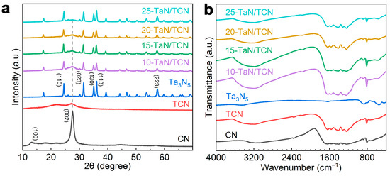 (a) XRD patterns and (b) FT-IR spectra of CN, TCN, Ta3N5, and x-TaN/TCN.
