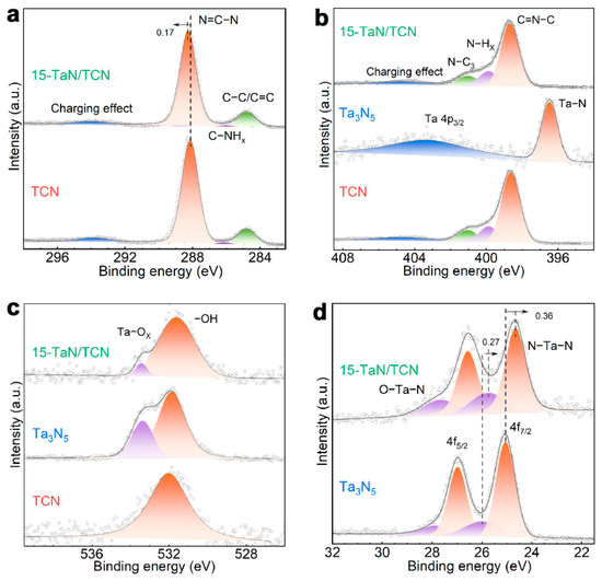 The XPS measurements were performed to investigate the chemical composition and surface chemical states of the samples. The XPS survey spectrum confirmed that 15-TaN/TCN mainly consisted of C, N, O, and Ta elements (Figure S5), further indicating the effective recombination of TCN with Ta3N5. As shown in Figure 3a, four peaks were observed in the C 1s spectrum of TCN at 284.8, 286.1, 288.1, and 293.8 eV, which were attributed to the C–C/C=C bond of adventitious carbon, sp2-hybridized carbon in C–NHx, sp2-hybridized carbon in N–C=N, and the charging effect, respectively [37,38]. In the N 1s spectrum (Figure 3b), TCN showed four peaks at 398.6, 399.9, 401.1, and 404.4 eV, which could be assigned to sp2-hybridized nitrogen in C=N–C, nitrogen in N–Hx, sp3-hybridized nitrogen in N–C3, and the charging effect, respectively [39]. For Ta3N5, two peaks were obtained at 396.5 and 403.2 eV, which were attributed to Ta–N and Ta 4p3/2, respectively [40]. In the O 1s spectrum (Figure 3c), TCN displayed a peak at 532.0 eV, corresponding to surface adsorbed oxygen in –OH [41]. The O 1s spectrum of Ta3N5 could be deconvoluted into two peaks at 531.9 and 533.4 eV, which were attributed to surface lattice oxygen and adsorbed oxygen, respectively [40]. The Ta 4f spectrum of Ta3N5 could be deconvoluted into four peaks (Figure 3d). Among them, the two relatively strong peaks at 25.1 and 27.0 eV, with a fixed 4:3 area ratio, were attributed to 4f7/2 and 4f5/2 in N–Ta–N. The two relatively weak peaks at 26.0 and 27.9 eV, also with a fixed 4:3 area ratio, were assigned to 4f7/2 and 4f5/2 in O–Ta(V)–N [23]. The C 1s and N 1s spectra of 15-TaN/TCN were similar to those of TCN, but the N–C=N peak in the C 1s spectrum shifted to a more positive binding energy position. In addition, the Ta 4f spectrum of 15-TaN/TCN resembled that of Ta3N5, but an obvious negative shift of these peaks was observed. These results demonstrated that electrons were transferred from TCN to Ta3N5 in the 15-TaN/TCN heterojunction, leading to an increase of electron density in Ta3N5.