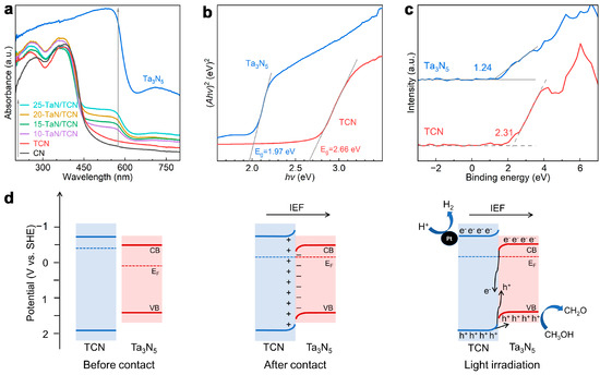 The optical absorption property was an important factor that influenced the photocatalytic activity of a catalyst. Shown in Figure 5a are the UV–vis diffuse reflection spectra (DRS) of the as-prepared samples. Ta3N5 showed prominently higher light absorption capacity than pristine CN and TCN, which was consistent with their different colors (Figure S11). In addition, the absorption capability of the x-TaN/TCN composites was close to that of TCN due to the low content of Ta3N5. With increasing Ta3N5 content, the light absorption ability of x-TaN/TCN gradually increased. Furthermore, as shown in Figure 5b and Figure S12, the Tauc plots for CN, TCN, Ta3N5, and x-TaN/TCN were obtained using the Kubelka–Munk function ((Ahv)n = A(hν − Eg)) [43]. The bandgap values and morphological characteristics of samples are summarized in Table S6. Among these materials, the energy band gaps (Eg) of Ta3N5 and TCN were estimated to be 1.97 and 2.66 eV, respectively (Figure 5b). The Mott–Schottky plots of Ta3N5 and TCN exhibited positive slopes, suggesting the n-type semiconductor characteristics. Accordingly, the conduction band (CB) potentials (ECB) of Ta3N5 and TCN, which were approximately equal to their flat band potentials [44], were estimated to be −0.57 and −0.75 eV, respectively (Figure S12). According to the equation EVB = ECB + Eg (vs. SHE), the valence band (VB) potentials (EVB) of Ta3N5 and TCN were calculated to be 1.40 and 1.91 eV. Furthermore, XPS VB spectra revealed that the potential difference (ED) between the EVB and the Fermi levels (EF) (ED = EVB − EF) of Ta3N5 and TCN were 1.24 and 2.31 eV, respectively (Figure 5c) [45]. Thus, the EF values of Ta3N5 and TCN were estimated to be 0.16 and −0.4 eV, respectively.