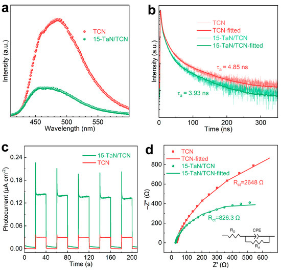 (a) Steady-state PL spectra, (b) TRPL spectra, (c) transient photocurrent response spectra, and (d) EIS Nyquist plots of TCN and 15-TaN/TCN.