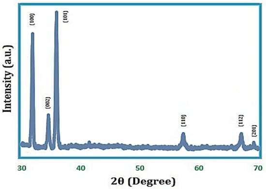 The XRD investigation identified prominent wide peaks at 2θ values of 31°, 34°, 36°, 57°, 67°, and 69°, which correspond to the diffraction planes (100), (002), (101), (110), (112), and (201) of the ZnO NS, respectively. The observed peaks aligned with conventional reference data from the International Centre for Diffraction Data, validating the nanostructure’s structural identification. The significant peaks at (100), (002), and (101) confirmed the establishment of a pure wurtzite crystal structure, with no impurities seen, thereby affirming the excellent purity of the synthesized material. The pronounced peak at 31° indicated that crystallization mostly took place along this favored direction. The average crystallite size was determined to be 36.44 nm using the Scherrer equation, which relies on the full width at half maximum (FWHM) of the (100) plane, illustrating the inverse relationship between peak width and crystallite size.