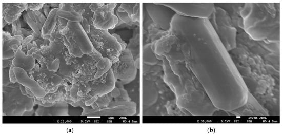 SEM images of biosynthesized ZnO NS at different magnifications. Panel (a): SEM image at 12,000× magnification; Panel (b): SEM image at 35,000× magnification.