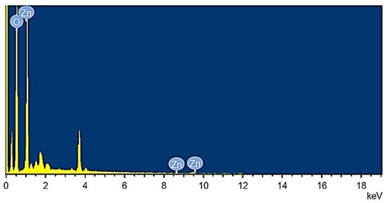 The biosynthesized ZnO NSs were characterized using multiple techniques to gain insights into their structural and chemical properties. X-ray diffraction (XRD) analysis was conducted with a Rigaku Smart Lab diffractometer, scanning over the 2θ range of 30° to 70° using Cu-Kα radiation (1.54 Å). The scan rate was set at 0.02 steps per second, with a step size of 0.01°, to determine the crystallinity of the nanostructures. The scanning electron microscopy (SEM) analysis was performed using a JEOL (Peabody, MA, USA) JSM-6510 LV SEM equipped with an Oxford EDS system at 200 kV to study the surface morphology and elemental composition of the ZnO NS. For a more detailed structural investigation, transmission electron microscopy (TEM) was employed at magnifications ranging from 10 to 50 nm to observe the fine details and size distribution of the nanostructures. To investigate the surface functional groups, Fourier transform–infrared spectroscopy (FT-IR) was carried out using a Thermo Scientific Nicolet iS10 FT-IR spectrometer (Waltham, MA, USA), providing insights into the chemical bonds present in the material. Finally, the optical properties of the ZnO NSs were analyzed using UV-visible spectroscopy (UV-vis) with a Perkin–Elmer spectrophotometer, which provided valuable information about the absorption characteristics of the nanostructures.