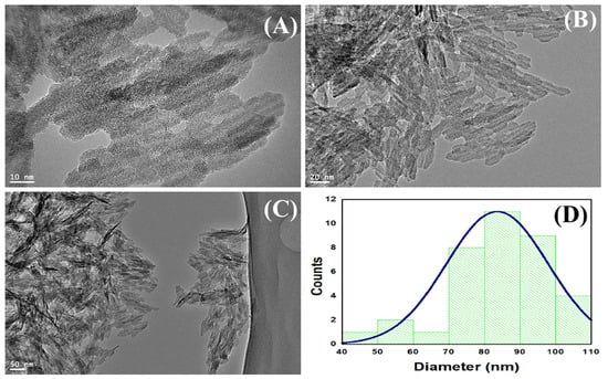 TEM images of biosynthesized ZnO NS at different magnifications. Panel (A): TEM image at 10 nm magnification showing the nanorod structure. Panel (B,C): TEM image at 20 nm, 50 nm magnification showing the fine details of the nanorod morphology. Particle size distribution histogram of the biosynthesized ZnO NS derived from TEM images. (D) The histogram shows a narrow distribution with a peak at ~80 nm, confirming the uniformity of the nanostructures.