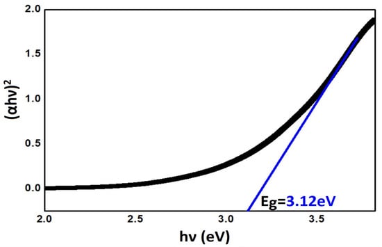 Tauc plot of the biosynthesized ZnO NS showing the optical bandgap of 3.12 eV, which is indicative of the material’s semiconducting properties.