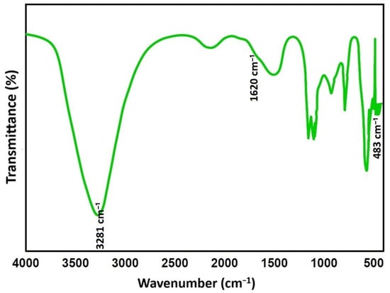 The FTIR spectrum of the ZnO NS displays several key bands that provide insight into the material’s structure and surface characteristics. The most prominent feature is a broad band between 3400 and 3600 cm−1, which is attributed to O-H stretching vibrations from surface hydroxyl groups or water molecules adsorbed on the surface of the nanostructures. This suggests that the ZnO NSs are likely exposed to moisture or possess hydroxylated surfaces, which is common in nanostructures due to their high surface area. Another notable feature is the band around 1620 cm−1, which typically corresponds to C-H bending vibrations from organic contamination, possibly originating from residual organic capping agents or environmental contamination. The peak around 483 cm−1 is a clear indicator of the Zn-O stretching vibration, a characteristic and distinctive band for zinc oxide, confirming the presence of ZnO in the sample. The position and intensity of this peak are consistent with the expected ZnO signature, indicating that the nanostructures are primarily composed of zinc oxide. Additionally, smaller peaks between 1000 and 1200 cm−1 are observed, which are usually attributed to C-O stretching vibrations, likely originating from organic groups that may have been used during synthesis or are present as surface contaminants. Overall, the FTIR spectrum confirms the presence of ZnO NSs with surface hydroxylation and possible organic capping or contamination, which is common in synthesized nanoparticle materials.