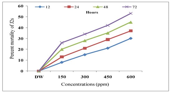 Impact of varying ZnO NS concentrations on M. incognita J2s mortality during 12, 24, 48, and 72 h of in vitro incubation.