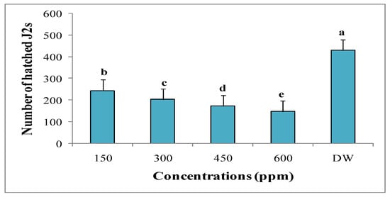 The bioassay demonstrated considerable variation among various concentrations of ZnO NS regarding J2 hatching inhibition (Figure 10). Employing a direct contact approach, all concentrations (150, 300, 450, 200, and 600 ppm) markedly decreased J2 hatching in comparison to the control (DDW). The level of inhibition escalated with increasing doses, with 600 ppm exhibiting the most significant impact, followed by 450 ppm and 300 ppm. The minimal inhibition was recorded at 150 ppm. J2s’ hatching inhibition improved simultaneously as the concentration grew progressively from 150 to 600 ppm. Different ZnO NS concentrations (150, 300, 450, 200, and 600 ppm) had varied inhibitory effects on J2 hatching, as shown in Figure 10.