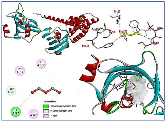 Molecular docking interaction of Hsp90 with ZnO NS. The binding pocket and interacting residues of Hsp90 (PDB ID: 2XJX) are illustrated, highlighting hydrogen bonds (green), π-donor hydrogen bonds (purple), and π-alkyl interactions (pink). The secondary structure of Hsp90 is depicted in ribbon format, with α-helices (red), β-sheets (cyan), and loops (grey). The ZnO nanostructure interaction involves key residues such as ILE87, TRP90, TYR57, PHE67, and PHE130, with a binding energy of −6.156 kcal/mol.