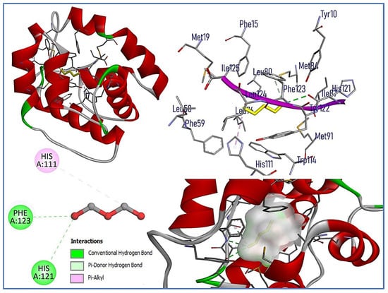 Molecular docking interaction of ODR1 with ZnO NS. The binding site and key interacting residues of ODR1 (PDB ID: 3K1E) are shown, indicating hydrogen bonding (green), π-donor hydrogen bonding (purple), and π-alkyl interactions (pink). The protein structure is represented with α-helices (red), β-sheets (cyan), and loops (grey). ZnO NS binding involves residues PHE123, HIS121, and HIS111, with a binding energy of −6.33 kcal/mol.