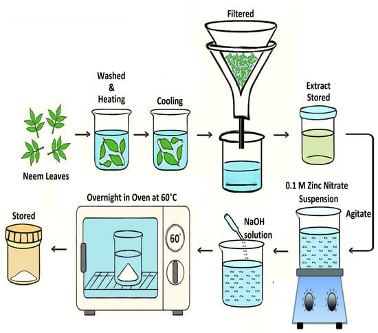 Schematic representation of the green synthesis process for ZnO NSs using neem leaf extract. The process begins with the preparation of neem leaf extract, followed by the reaction with zinc nitrate solution, the addition of NaOH to form ZnO precipitates, and the subsequent drying process to obtain the ZnO NSs.