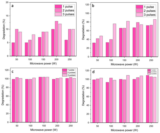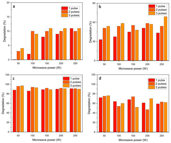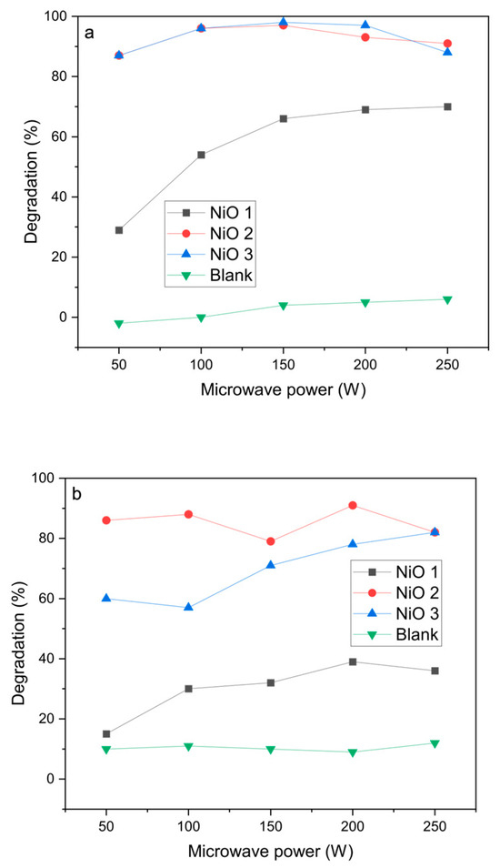 The NiO materials were then tested as catalysts for the microwave-assisted degradation of azo dyes. Initial experiments were carried out using a single 30 s pulse at different powers between 50 and 250 W (Figure 4). Blank reactions without the catalysts showed very low degradation efficiencies under microwave heating, which confirms that microwave radiation alone is not able to decompose the azo dyes.
